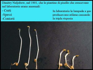 La sua produzione avviene a livello delle regioni nodali del fusto e nei germogli in accrescimento. L’etilene è importantissimo principalmente per gli effetti che causa sui fiori e sui frutti (maturazione), effetti che un tempo venivano erroneamente attribuiti alle auxine che in realtà ne stimolano semplicemente la sintesi. Inoltre sembra che questo ormone contribuisca alla produzione di peli radicali che sono fondamentali per l’assorbimento dei nutrienti dal terreno. La risposta tripla della pianta all’etilene è fondamentale soprattutto nelle prime fasi di vita della pianta. Tutti abbiamo sicuramente notato che quando un seme spunta fuori dal terreno, presenta inizialmente l’apice curvato verso il basso. Questa curvatura è causata da questo ormone ed ha come scopo quello di proteggere il germoglio dagli ostacoli incontrabili durante il movimento nel terreno. Una volta che la giovane plantula giunge alla luce l’etilene si degrada e l’apice si raddrizza. Per quanto riguarda gli effetti sulla senescenza e la successiva caduta delle foglie, l’auxina e l’ABA hanno un ruolo fondamentale, ma è l’etilene che innesca il meccanismo di abscissione (distacco della foglia dal fusto). Durante la bella stagione la pianta si accresce e gli apici producono elevati quantitativi di auxina. L’elevata presenza di auxina all’interno della foglia riduce la sensibilità del tessuto all’etilene. All’arrivo dei primi freddi l’attività vegetativa della pianta si riduce e di conseguenza diminuisce la concentrazione di auxina all’interno delle foglie innescando l’aumento della sintesi di etilene. Inoltre, il tessuto fogliare diventa maggiormente sensibile a questo ormone che in seguito a delle attività enzimatiche di degradazione della parete cellulare viene degradato in prossimità del punto di giunzione col fusto portando alla caduta della foglia. In agricoltura questo ormone viene ampiamente utilizzato per accelerare la maturazione dei frutti, per sincronizzare la fioritura e la fruttificazione e per velocizzare la caduta delle foglie.